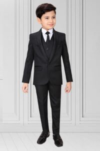 This bold black 3-piece tuxedo set is timeless and versatile. The structured silhouette, black satin lapel, and smart tie make it the go-to option for elegant